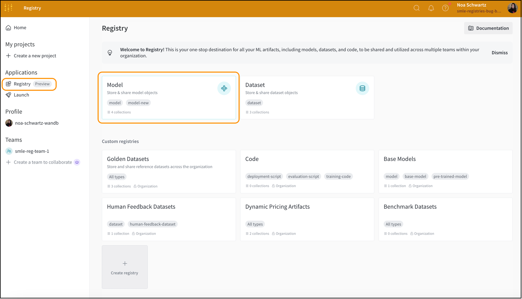 旧モデルレジストリとは異なり、W&B レジストリはモデルやデータセットレジストリに限定されません。特定のワークフローやプロジェクトニーズに合わせたカスタムレジストリを作成し、任意のオブジェクトタイプを保持できるようにします。この柔軟性により、チームは独自の要件に従ってアーティファクトを組織し、管理できるようになります。カスタムレジストリの作成方法について詳しくは、カスタムレジストリの作成を参照してください。